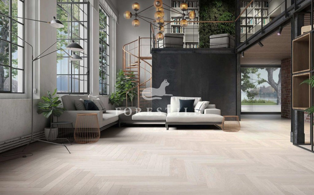 Michelangelo MONTBLANC jodełka klasyczna o wyjątkowej tonacji nasyconego bielą dębu z delikatną strukturą, o niewielkim zróżnicowaniu kolorystycznym i delikatnym rysunku usłojenia. Ta podłoga doda pomieszczeniom subtelnej, ponadczasowej elegancji.