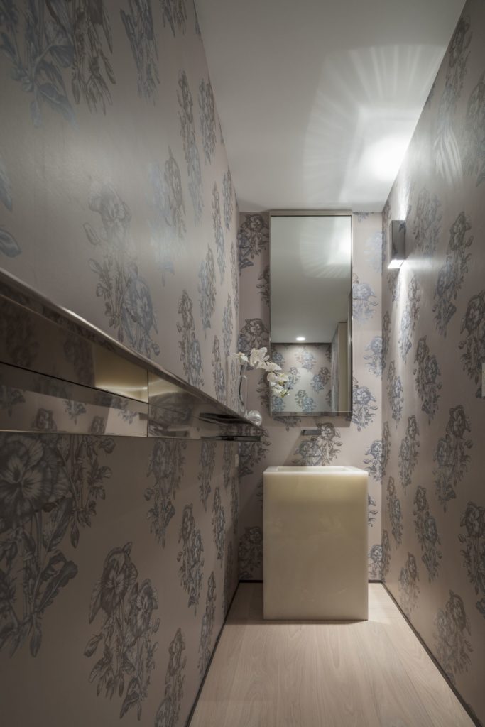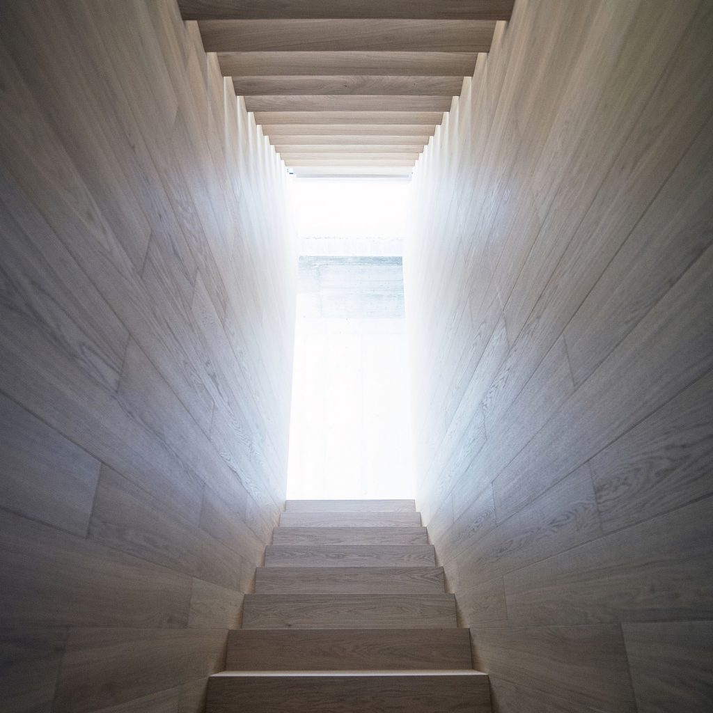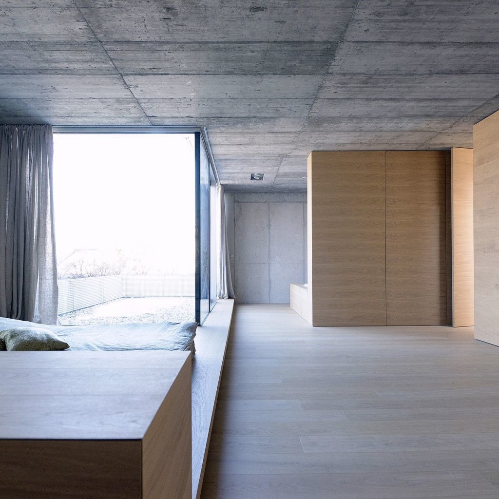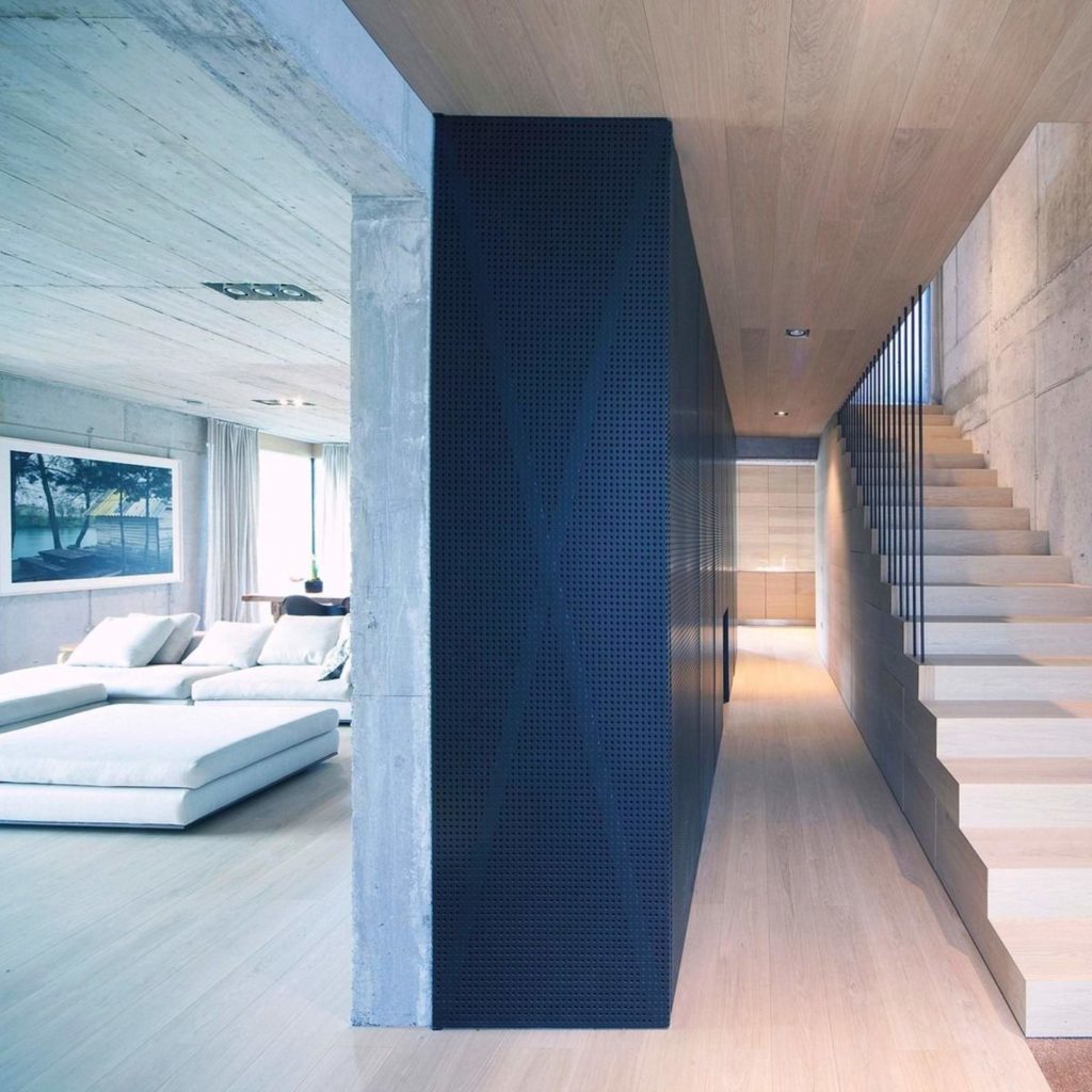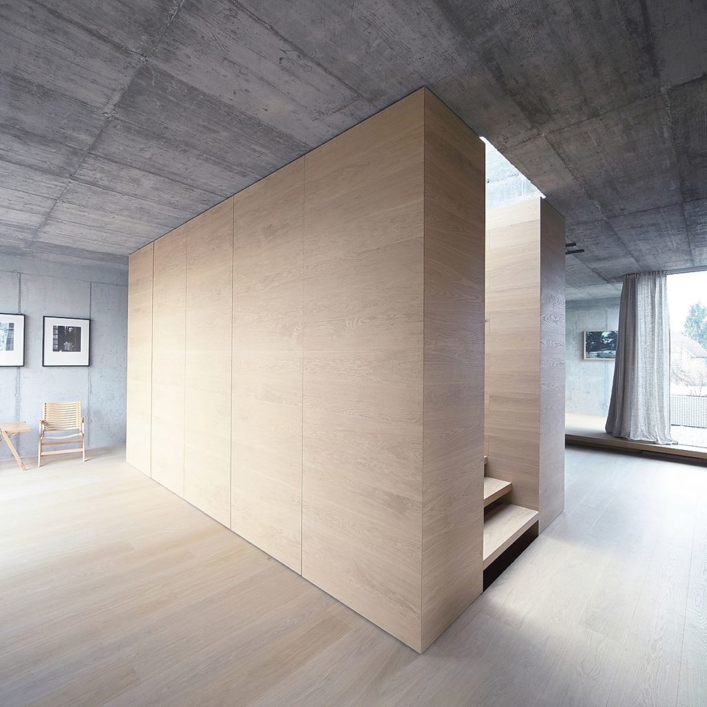 Wnętrze składa się z dwóch głównych elementów: żelbetowej konstrukcji oraz drewnianej skorupy. Budynek nie posiada piwnicy, ale płaskie ściany ustępują miejsca rozkładanym szafkom, półkom i szufladom, które pełnią funkcję przechowalni. Lekkości i przestronności całego domu nadają drewniane podłogi Listone Giordano, które idealnie komponują się z surowym betonem. Dodatkowo ciepłe tonacje drewna przepływające po podłodze i ścianach, w niektórych miejscach płynnie przekształcają się w meble, takie jak: szafy, regały i łóżka, co sprawia, że wnętrze jest spójne i harmonijne.