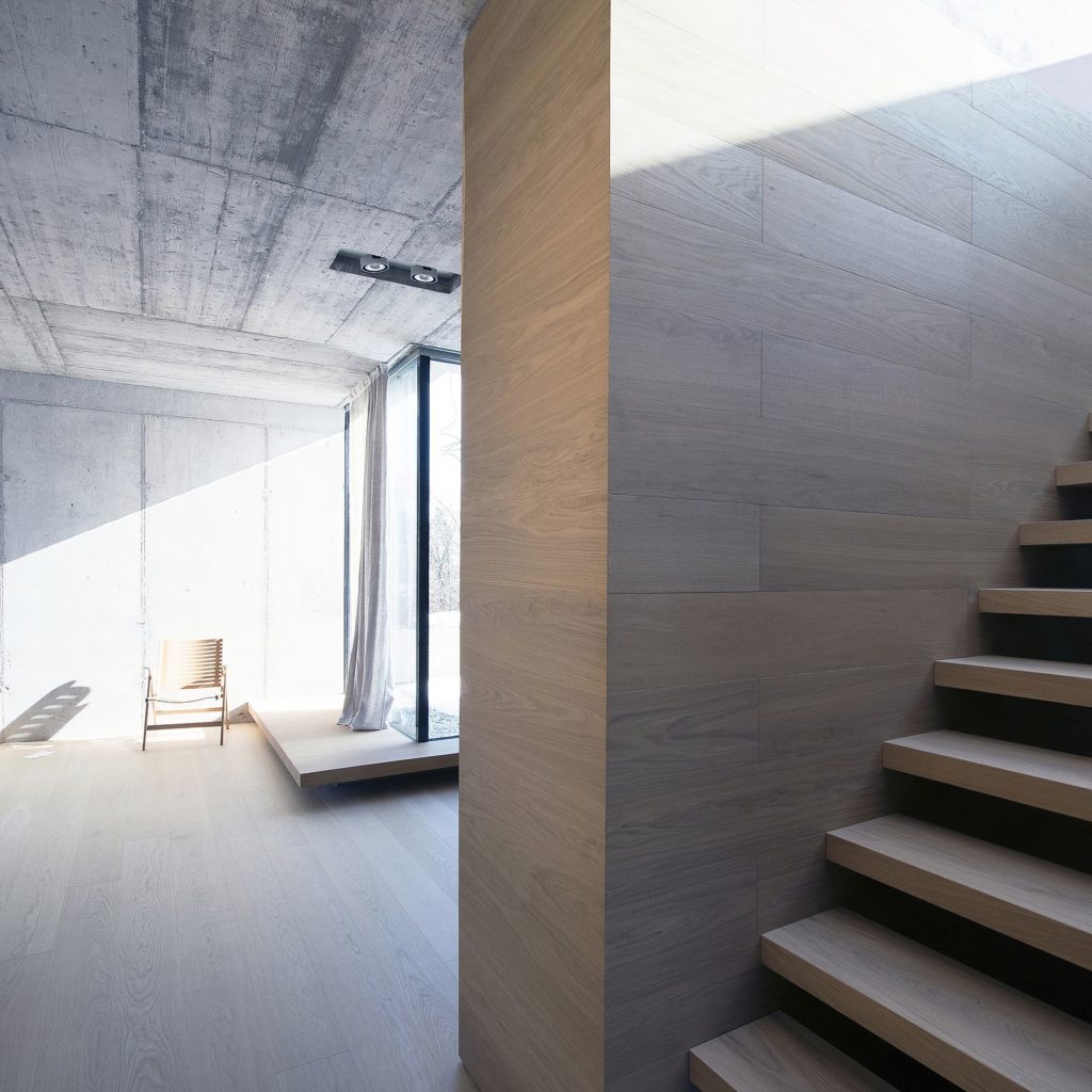 Mieszkańcami tej wyjątkowej słoweńskiej rezydencji jest pięcioosobowa rodzina i to właśnie jej potrzebami kierowali się architekci z pracowni OFIS. Opracowana przez nich koncepcja wymagała zmaksymalizowania otwartej powierzchni mieszkalnej przy jak największym ograniczeniu ścian. Przestrzeń podzielono zatem poziomami, nadając kondygnacjom odpowiednie funkcje – parter to część wspólna, pierwsze piętro stanowi strefę dziecięcą, a najwyższa kondygnacja jest strefą rodzicielską.